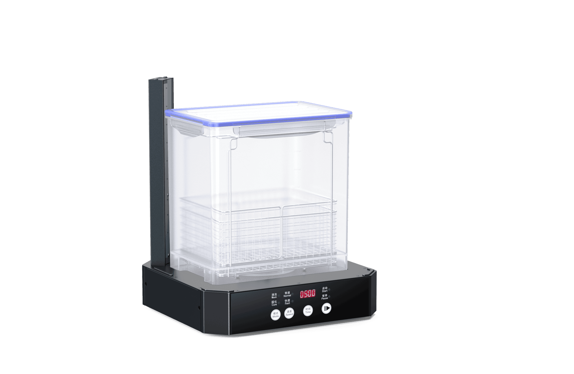 Mașina de spălare și polimerizare UW-03 oferă o soluție două în unu pentru curățarea și polimerizarea imprimărilor 3D. Acest aparat de a treia generație oferă un vortex mai puternic și este mai eficient din punct de vedere al spațiului decât predecesorul său.