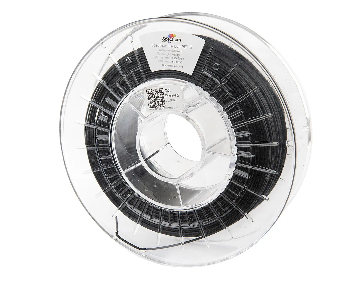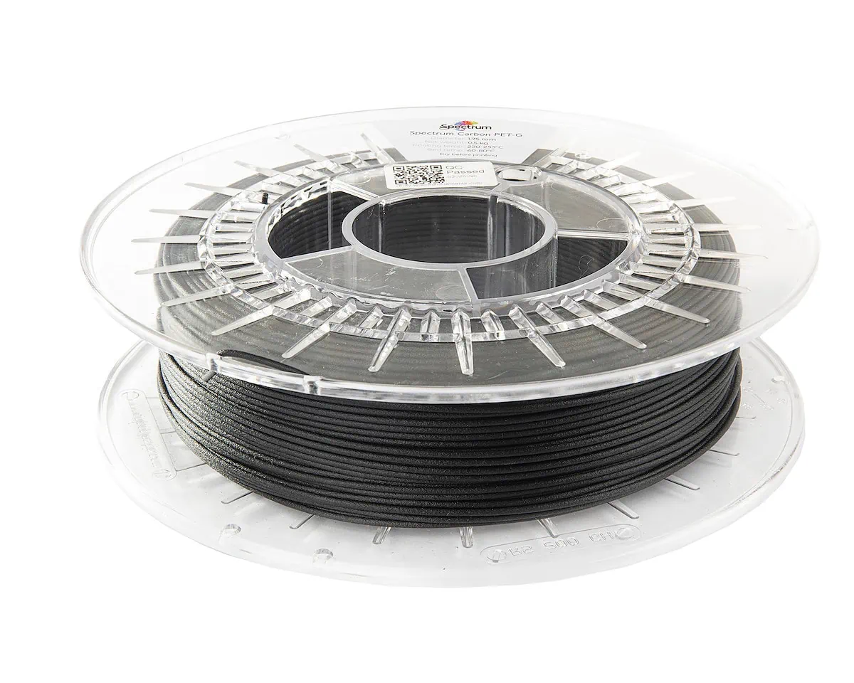 Spectrum PET-G Carbon este un filament pe bază de PET-G modificat, amestecat cu fibre de carbon, care contribuie la o rigiditate, o rigiditate și o rezistență la tracțiune semnificativ mai mari, păstrând în același timp contracția redusă și aderența foarte bună la platformele de construcție caracteristice PET-G-ului pur. Adăugarea a 10% fibră de carbon permite ca produsele imprimate să aibă suprafețe mate, ceea ce îmbunătățește semnificativ proprietățile estetice ale produselor imprimate.