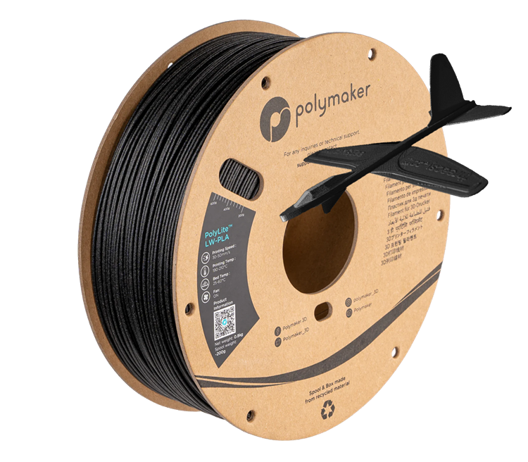 PolyLite™ LW-PLA este o spumă PLA specială, concepută pentru a imprima la setări similare cu PLA obișnuit, dar cu jumătate din greutate (0,6 g/cm3). Densitatea sa scăzută face din PolyLite™ LW-PLA o alegere excelentă pentru imprimarea pieselor ușoare, inclusiv a fuselajelor, pieselor de aripi și a altor componente ușoare pentru aeronave RC. Datorită tehnologiei de spumare, acest LW-PLA imprimă, de asemenea, cu o suprafață foarte mată care ascunde straturile.
