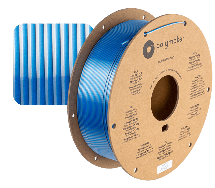 PolyLite Dual Silk PLA de înaltă calitate, lucios și dicromatic imprimă modele în două culori cu un efect dinamic de tranziție a culorilor.