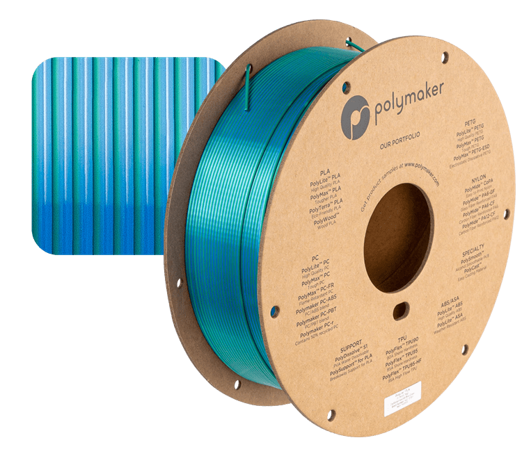 PolyLite Dual Silk PLA de înaltă calitate, lucios și dicromatic imprimă modele în două culori cu un efect dinamic de tranziție a culorilor.