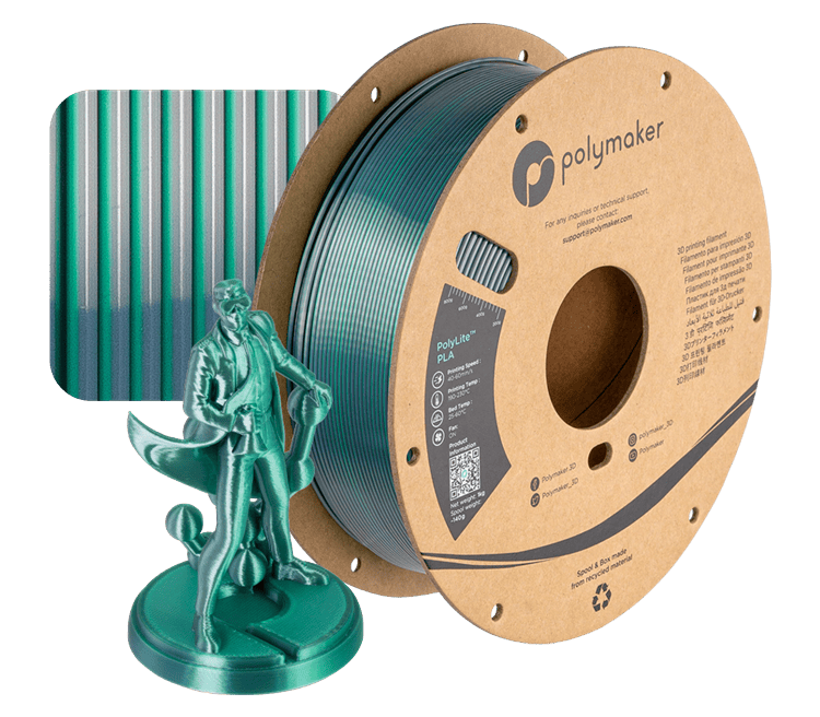 PolyLite Dual Silk PLA de înaltă calitate, lucios și dicromatic imprimă modele în două culori cu un efect dinamic de tranziție a culorilor.