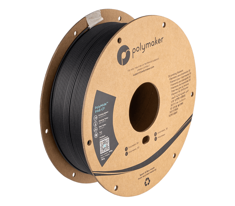PolyMide™ PA6-CF este un filament PA6 (nailon 6) armat cu fibră de carbon. Întărirea din fibră de carbon asigură o rigiditate, o rezistență și o rezistență la căldură semnificativ îmbunătățite, cu o aderență excepțională a stratului.