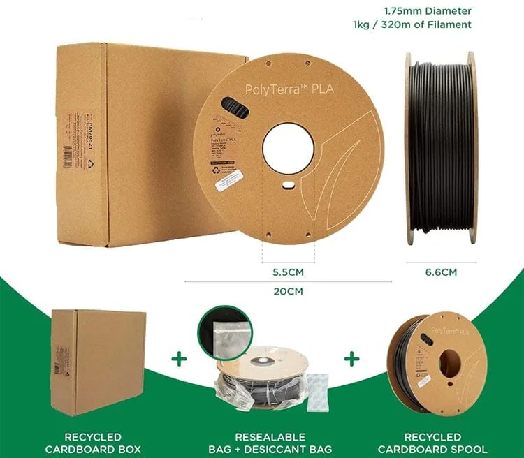 • Bioplastic Mat PLA Formula – PolyTerra™ PLA se bazează pe un material nou dezvoltat de Polymaker numit FBC (Fully Bio Compound). Este un compus din Ingeo PLA de înaltă calitate completat cu elemente naturale. Rezultatul este un filament PLA cu un conținut mai mic de plastic, care se simte mai moale și mai maleabil/mai puțin fragil pe bobină. Formula Polymakers FBC conține mai puțin plastic PLA care se degradează, ceea ce îmbunătățește rata de degradare în condiții industriale specifice. Ca și în cazul altor PLA, rata de degradare este încă foarte lentă la temperatura ambiantă.