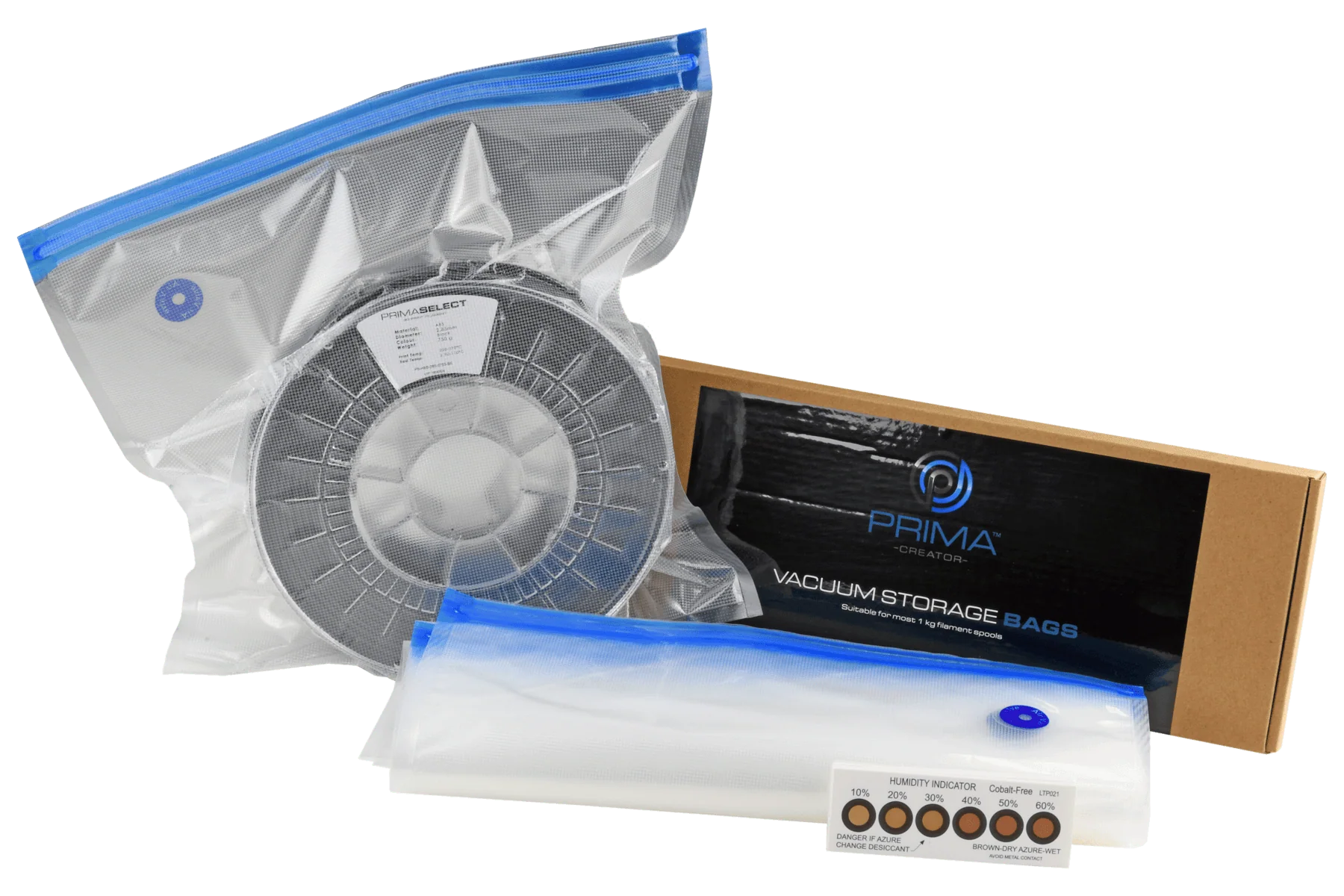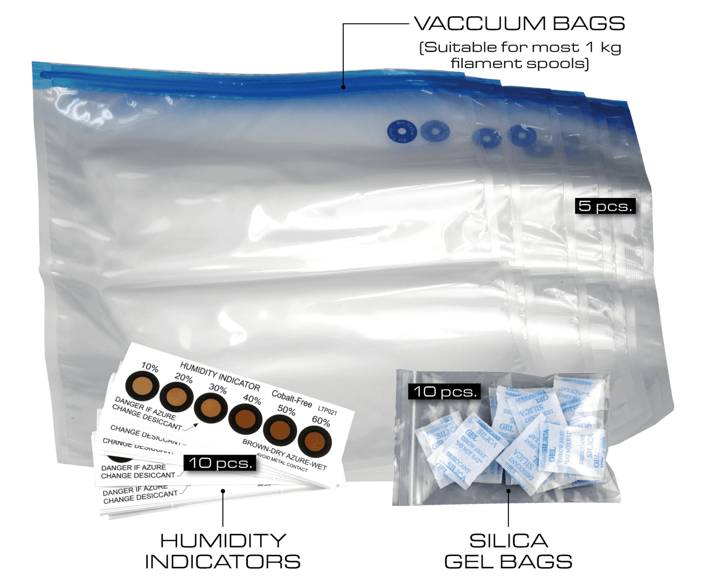 Sigilarea bobinelor cu filamente într-un sac de vid este o modalitate excelentă de a le proteja. Sacii împiedică murdăria, praful și mai ales umezeala să ajungă la filamentul dumneavoastră. Păstrarea filamentelor sigilate și uscate este cel mai bun mod de a le proteja și de a le păstra proprietățile. Acest lucru este valabil în special pentru filamentele higroscopice, cum ar fi nailonul (PA) și PVA.