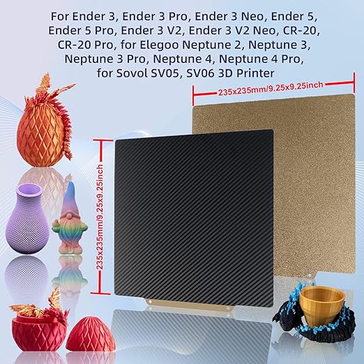 Placă de oțel cu arc PET+PEI cu două fețe, o parte este suprafața de imprimare netedă – folie PET îmbunătățită. Cealaltă parte este suprafața PEI mată, prezentând o atingere mată caracteristică a suprafeței autocolantului, asigură o aderență mai mare la model și imprimare fără deformare.